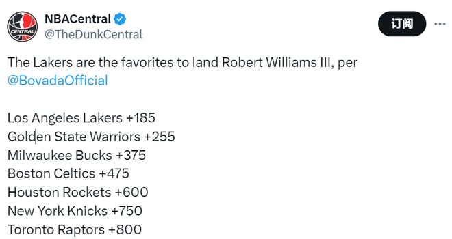 羅威的最新下家賠率如下:1.湖人(+185)、2.勇士(+255)、3.雄鹿(+375)、4.凱爾特人(+475)、5.火箭(+600)、6.尼克斯(+750)、7.猛龍(+800)。